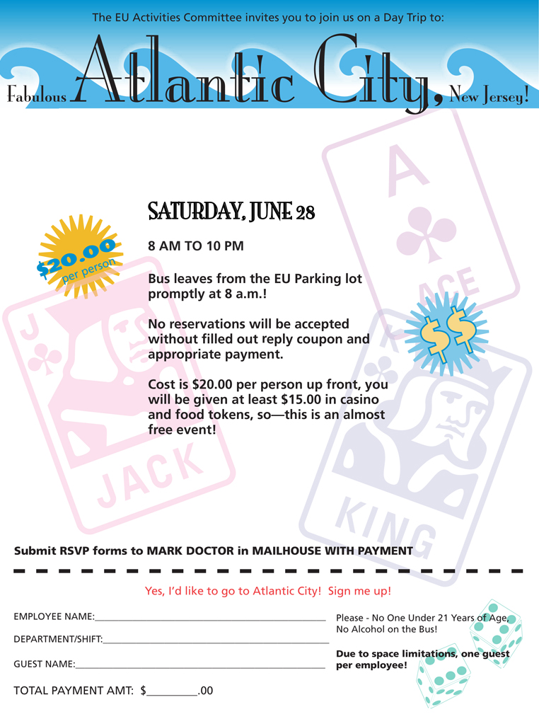 This is a flyer designed for my employer. The header art for “Atlantic City” was designed in Adobe illustrator. All text and other graphics were placed into an InDesign file.